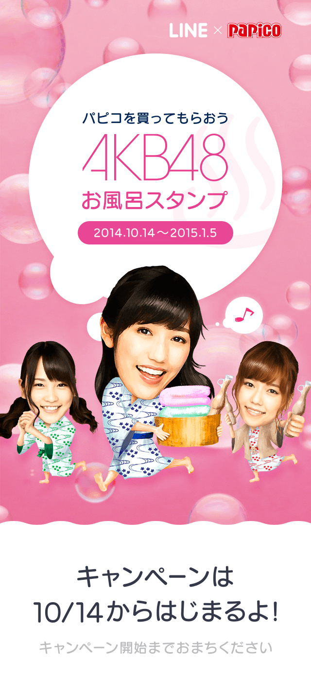 — グリコ広報 (@glico_PR) 2014, 10月 2「パピコ×AKB48 LINEオリジナルお風呂スタンププレゼント」キャンペーンは、10月14日(火)から開始。対象商品がなくなり次第終了です。http://t.co/cKWnhKQ5Ic