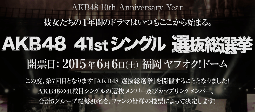 AKB48の41枚目シングルの選抜メンバー及びカップリングメンバー、合計5グループ総勢80名を、ファンの皆様の投票によって決定します。