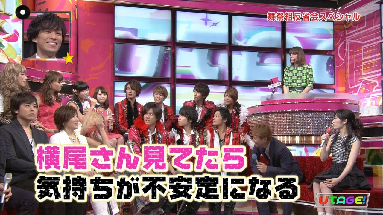 今週のUTAGE!は「Kis-My-Ft2」をゲストに迎え、「舞祭組反省会」なる企画でした。舞祭組のハモタイムでの事故や、奇跡の成功など、過去を振り返るものでした。横尾さん、おもしろい。