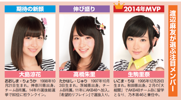 渡辺麻友(以下、渡辺):過去にも組閣はありましたが、姉妹グループを含めて、全チームシャッフルという大規模なものは2014年2月の「大組閣祭り」が初めてだったので、当時はみんな動揺していました。でも、最近は組閣前より、新しい魅力を出せているメンバーが増えてきたと思います。特に兼任のメンバーはすごく努力をしているので、みんな2014年のMVPではないかと思いますが、その代表として私が選ぶのは、生駒(里奈)ちゃん。笑顔もよりかわいくなったし、自信のある表情も見せてくれるようになりました。