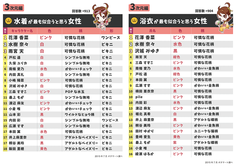 3次元の女性ランキングは、水着・浴衣ともに、花澤香菜さんと水樹奈々さんのワンツーフィニッシュとなりました。お二人は、弊社「理想の花嫁」アンケートでもTOP3に入るなど、もはや不動の人気といえます。