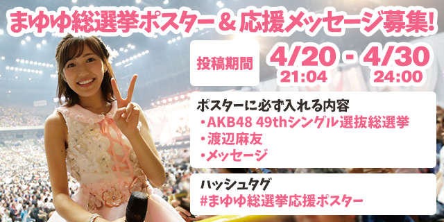 まゆゆを総選挙で再び1位にする為に、Twitter、Google+で総選挙応援のポスター&応援メッセージを募集しています!みんなで総選挙を盛り上げよう!沢山の投稿お待ちしております!